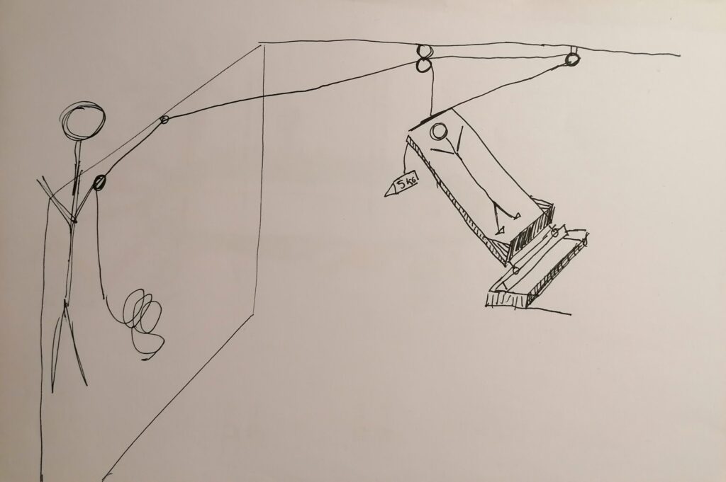 Die Besuchenden können auf ein Brett stehen es wird mit einem Flaschenzug gekippt und so die Person in die liege Position gebracht.